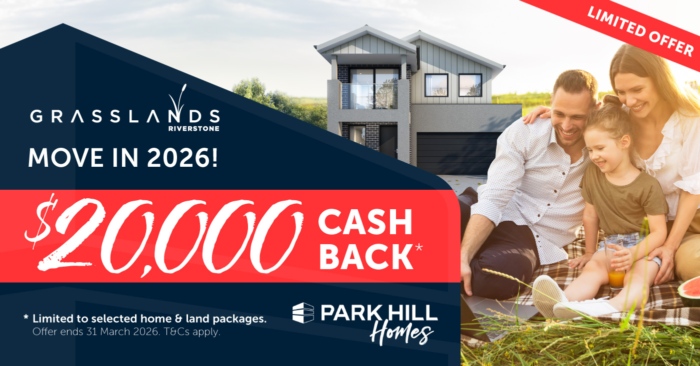 $20,000 Cash Back available on selected home and land packages at Grasslands Riverstone Estate only. Valid for reservations secured with a $2,000 fee between 15 December 2025 and 31 March 2026. Eligibility is subject to exchange of land and building contracts on or before 31 March 2026 and payment of all required deposits. Cash back will be provided at land settlement prior to construction in 2026. Not available in conjunction with any other offer. Terms, conditions and eligibility criteria apply. Offer may be amended or withdrawn at any time. Park Hill Homes Licence No. 353389C.
